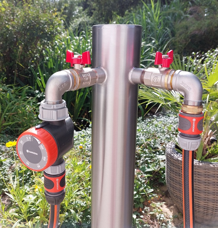 Unsere Edelstahl Wasserzapfstellen bestehen aus V2A Rundrohr mit einem Rohrdurchmesser von 88,9 x 2 mm. Alle Anschlüsse sind in 3/4" Zoll gehalten, wobei Änderungen der Anschlüsse ohne Aufpreis möglich sind. Die Säulenhöhe beträgt standardmäßig 850 mm und bietet einen zweiten Anschluss für Ihren Schlauchwagen oder den Gartenschlauch. Wir empfehlen Gardena Produkte für die Bewässerung.
